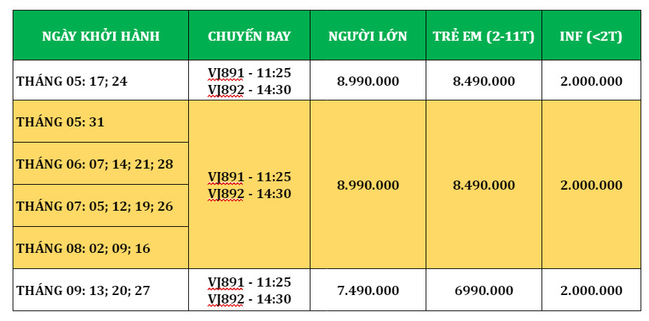 Đến giờ hẹn, xem và HDV đưa Qúy khách ra sân bay làm thủ tục trên chuyến bay VJ892 (14:30 – 16:45) trở về TP.HCM. Đoàn về tới TP.HCM chia tay Quý khách. Hẹn gặp lại Quý khách trong những chuyến đi tiếp theo.