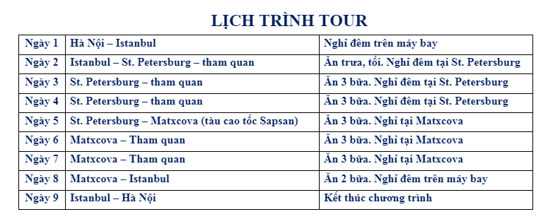 Chương trình du thuyền trên sông Neva, tham quan Cung điện Mùa Hè: Tuỳ vào tình hình thời tiết, nếu không đi được (do thời điểm đó nước đóng băng hoặc…), chúng tôi sẽ thay thế bằng chương trình mua sắm hoặc 1 điểm tham quan mới cho phù hợp với chương trình.