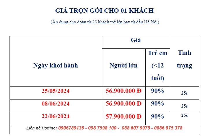 - Từ 12 tuổi trở lên: 100% giá tour.