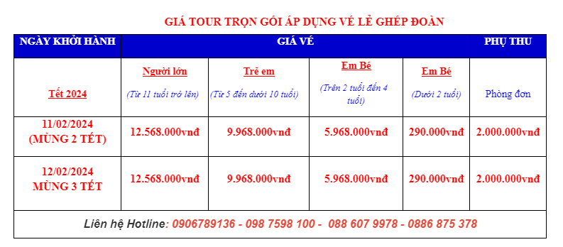 Trẻ em từ 11 tuổi trở lên mua 01 vé bằng giá tour người lớn.